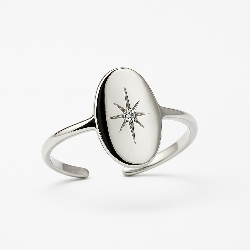 Adjustable An understated symbol of elegance, this adjustable star ring transcends occasion with its refined design. The open band construction ensures a perfect fit for any wearer, while the celestial motif conveys quiet confidence and timeless appeal. Versatile enough for layering or worn solo, it embodies the essence of contemporary luxury—where simplicity speaks volumes. A signature piece for those who favour substance over statement.
