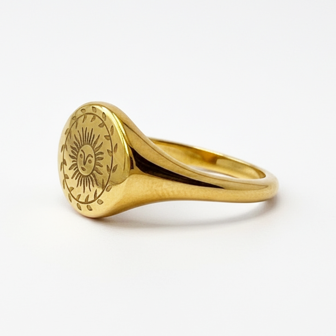 A timeless signet ring featuring a radiant sun motif, crafted with precision for everyday elegance. A premium material composition, delivering durability and a luxurious finish. This statement piece combines classic design with modern sophistication, making it an ideal choice for those seeking distinctive jewellery that transcends seasonal trends. Perfect as a personal signature accessory or a meaningful gift for someone who appreciates refined craftsmanship and symbolic design.